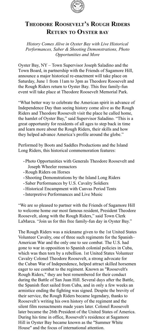 Renowned Theodore Roosevelt and Quentin Roosevelt reprisers spent the afternoon at Sagamore Hill meeting visitors, reading the Declaration of Independence, walking the grounds, and posing for photos and selfies at the "Presidential Photo Booth". The event also featured free tours of the Roosevelt Home, the Calliope Brass Band, a Junior Ranger Program, assorted lawn games and crafts for kids, historical exhibits at the Old Orchard Museum, as well as a variety of walking and self-guided touring options throughout the park.