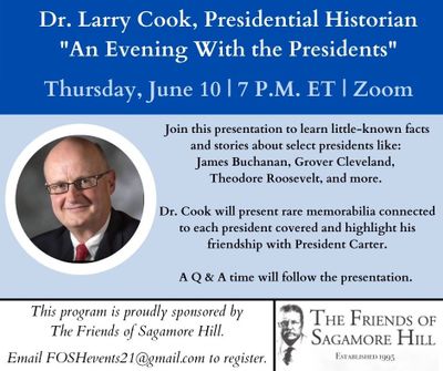 On Thursday, June 10, 2021, at 7:00 PM ET, over 50 virtual attendees joined The Friends of Sagamore Hill (via Zoom) for an informative and entertaining presentation by Dr. Larry Cook, Presidential Historian, "An Evening with The Presidents".