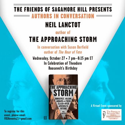 On Wednesday, October 27, 2021, at 7:00 PM ET, over 65 virtual attendees joined The Friends of Sagamore Hill (via Zoom) in celebrating Theodore Roosevelt's birthday with an informative and entertaining conversation between authors Neil Lanctot and Susan Berfield, discussing Neil's new book, The Approaching Storm: Roosevelt, Wilson, Addams, and Their Clash Over America’s Future.